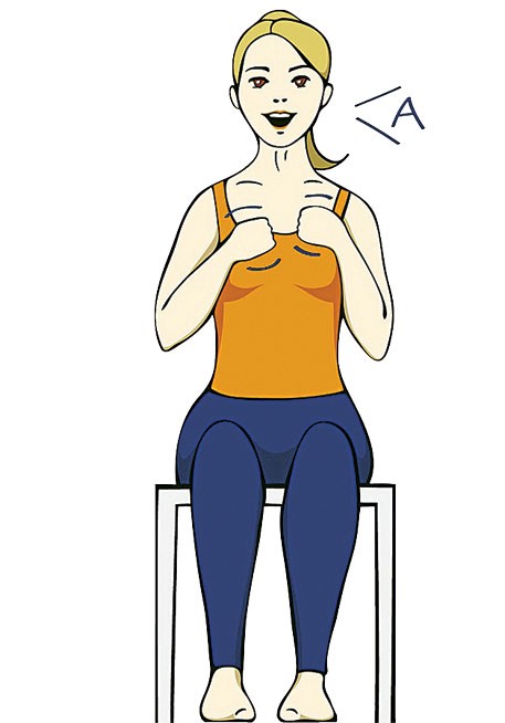 Это упражнение облегчает вывод мокроты при кашле. Сядь, выпрями спину. Дыхание ровное. Произноси гласные A, Э, И, O, У, одновременно постукивая себя кулаками по груди. Затем опусти руки, спокойно подыши носом и повтори упражнение.
