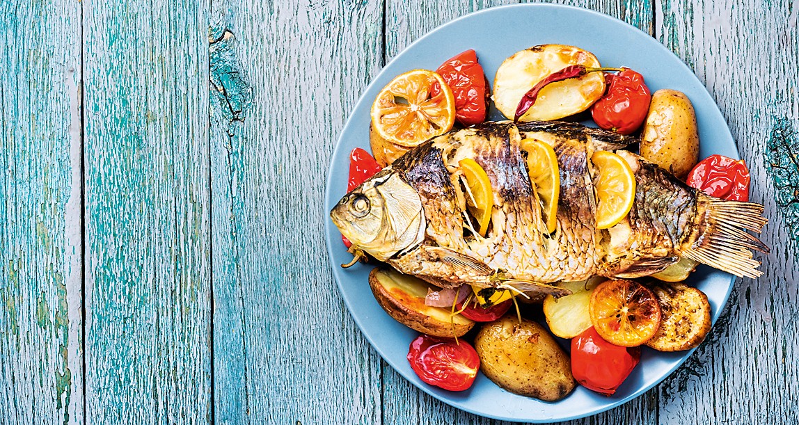 Приготовление: разрежь рыбу вдоль брюшка. Посоли, поперчи снаружи и внутри. Нарежь лук полукольцами, а лимоны кружочками. Выложи на лист фольги рыбу, начини ее веточками укропа, тимьяна, ломтиками лука, половинками черри и лимоном: сделай на рыбе надрезы и вложи в них ломтики лимона. Сверни фольгу конвертом, защипни края. Запекай рыбу в духовке 20 минут при температуре 2000.