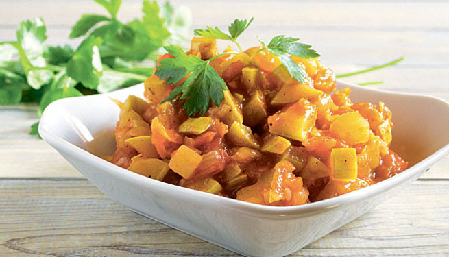 ИНГРЕДИЕНТЫ: • 300 г грудки • морковь • лук • сладкий перец • 1 г корня имбиря • 5 г карри • по 2 ст. л. сметаны и томатной пасты • соль, перец