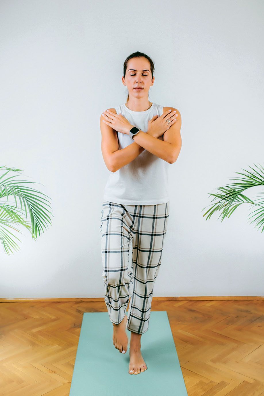 - Разуйся, встань на левую ногу, подняв правую и прижав руки к туловищу. Засеки время по секундной стрелке, закрой глаза и сохраняй эту позу, сколько сможешь. Повтори тест 3 раза и возьми за основу лучший результат.