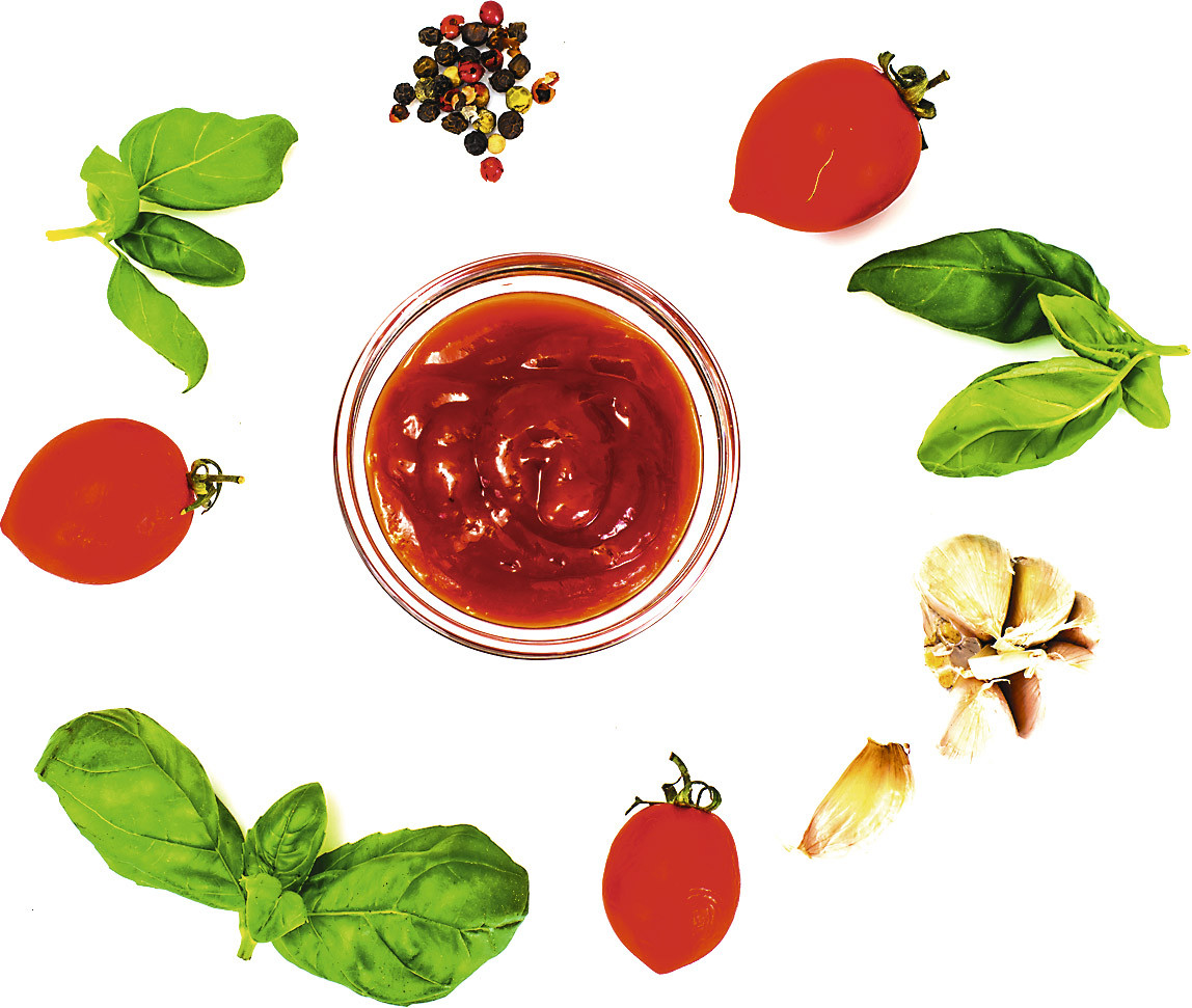 Приготовление. Томатную пасту развести с водой, тщательно размешать. Чеснок очень мелко порубить. Луковицу, зелень мелко нашинковать. Добавить сахарный песок, мелкую соль и молотый черный перец. Перемешать ингредиенты.