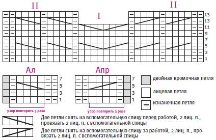 Вяжи по схемам Ал, Апр и В. Четные ряды вяжутся по рисунку: над лицевыми – лиц.п., над изнаночными – изн.п.