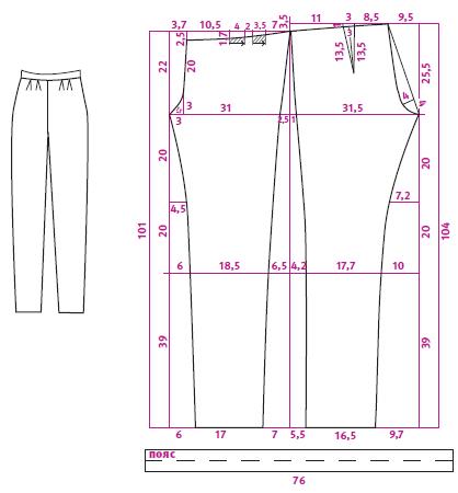 Важный момент: в предложенной конструкции брюк учтены припуски на швы 1 см. Но их можно сделать и больше (например, 3–4 см) – разные ткани дают разную посадку, поэтому хорошо, если будет возможность поправить.