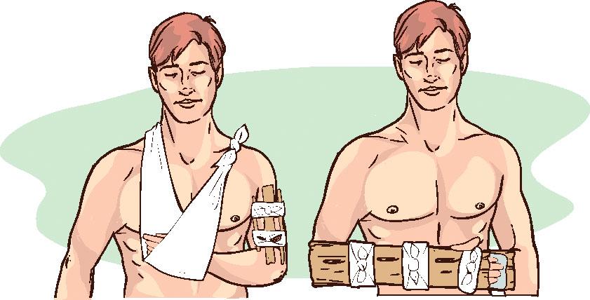 4. При переломе нижней конечности шины накладывай с двух сторон. При отсутствии подручных средств поврежденную ногу можно прибинтовать к здоровой ноге, а руку – к туловищу.