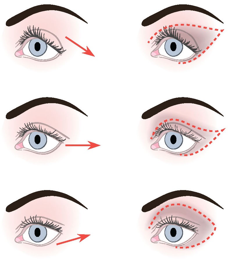 Такие глаза выглядят опущенными из-за направленных вниз внешних уголков. Как и в случае со сплошным веком, их визуально преобразит эффект «кошачьих глаз». Наноси подводку на верхнюю линию ресничек и выводи ее за внешний уголок вверх под углом приблизительно 45 градусов. Благодаря такому приему форма глаз станет симметричной. Важное правило, которого стоит придерживаться: нельзя использовать темные тени на подвижном веке или в уголках глаз. Поставь блики светящимися тенями на веки и область под бровью, а средний оттенок теней нанеси от внешних уголков к переносице и на внутреннюю складку века. Активно прокрашивай ресницы в средней части века. Так ты решишь задачу и визуально приподнимешь внешние уголки глаз.