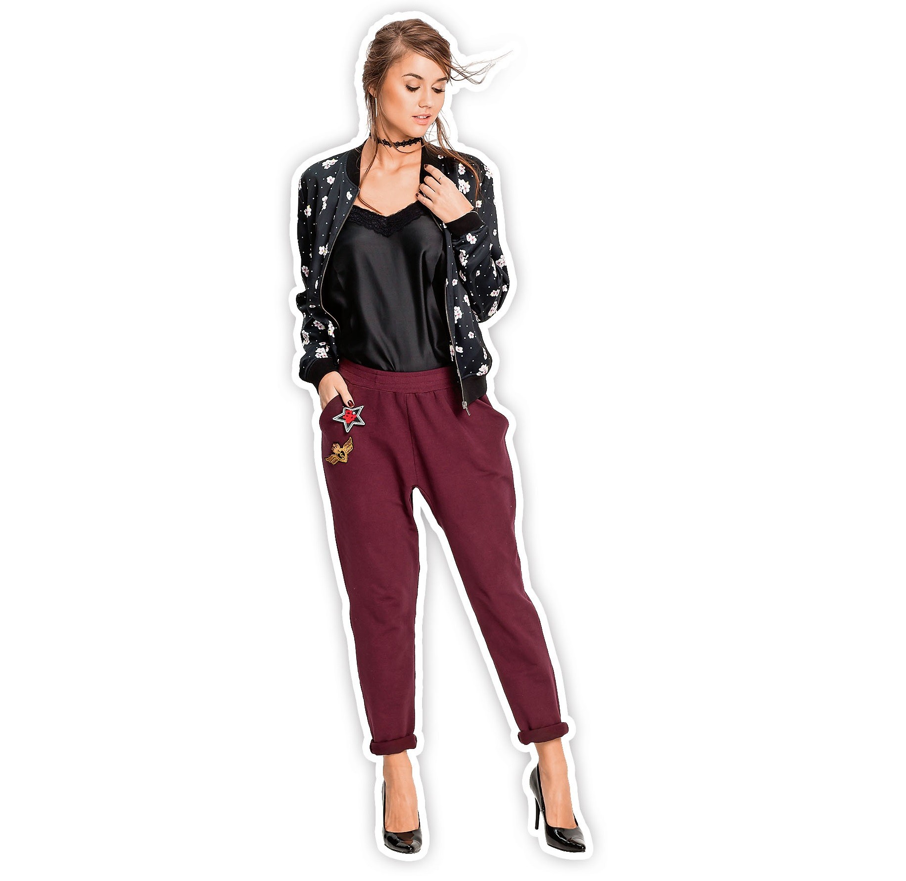 Бомбер с ярким флористическим принтом эффектно дополнит наряд в модной зеленой гамме. Это может быть и женственный вариант с юбкой или платьем, и более повседневный комплект с брюками или цветными джинсами. Обувь к такому образу подбирай в базовых тонах или в тон рисунку на куртке.