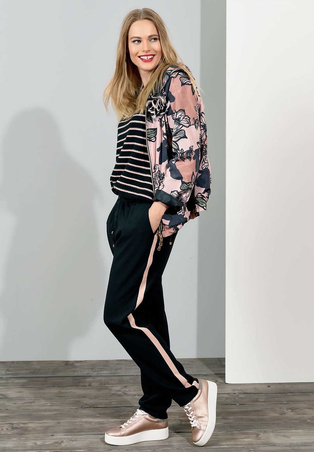 Обрати внимание, что роза в этом сезоне снова на пике моды. Это касается и стильного пыльнорозового оттенка, и разнообразных принтов и рисунков в виде соцветий. Смело примеряй бомберы в эффектной черно-розовой гамме, а также украшенные цветочным принтом.