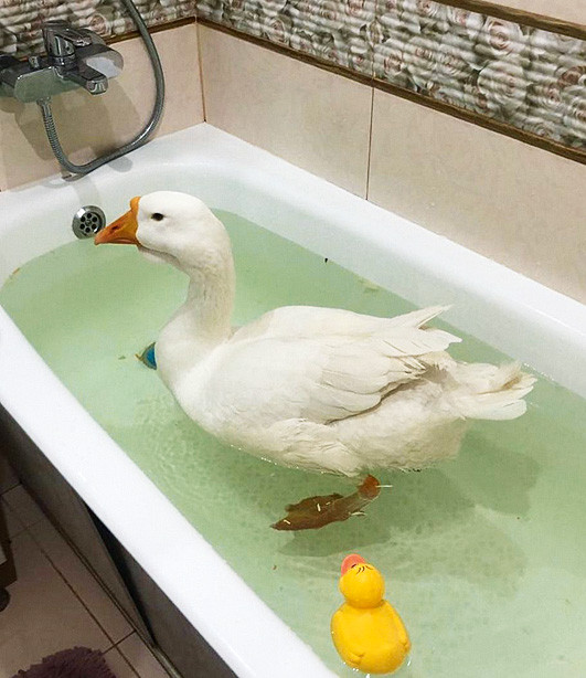 Теперь гусь с талдомской фермы живет в великолепных условиях, «ведет» свой блог, «раздает» интервью съемочным группам, а в свободное от работы время плавает в ванне с резиновой уточкой, покоряет бельевую сушилку, смотрит по ТВ программы о природе и на правах главного гоняет других любимцев семьи – кошек-сестер Нору и Груню. «Я очень всем доволен. Живу припеваючи, гогочу, когда хочу, ем яблочки и рад, что их ем я, а не лежу с ними на одном блюде», – «резюмирует» в Instagram (соцсеть признана в РФ экстремистской и запрещена) гусь-инфлюенсер.