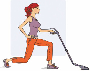 Когда пылесосишь, при каждом движении делай выпады – вперед и в стороны (по 20 раз). Держи спину прямо. Во время мытья полов отведи ногу назад и делай махи (30 раз). Поменяй ногу.