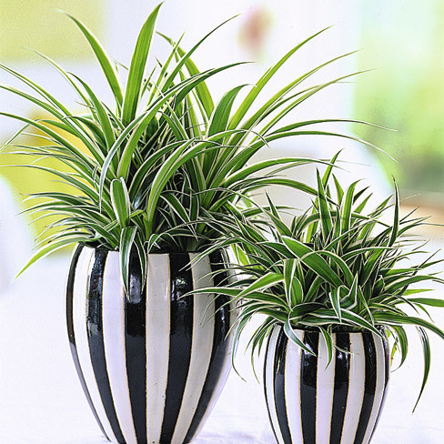 Хлорофитум. Санитар воздуха. Непритязателен, цветет мелкими белыми цветочками. Высасывает из воздуха вредные вещества, пыль, отдавая взамен чистый кислород. Не опасен, даже если пожевать листок. Симпатичные полосатые листики оживят интерьер, сделают его уютнее.