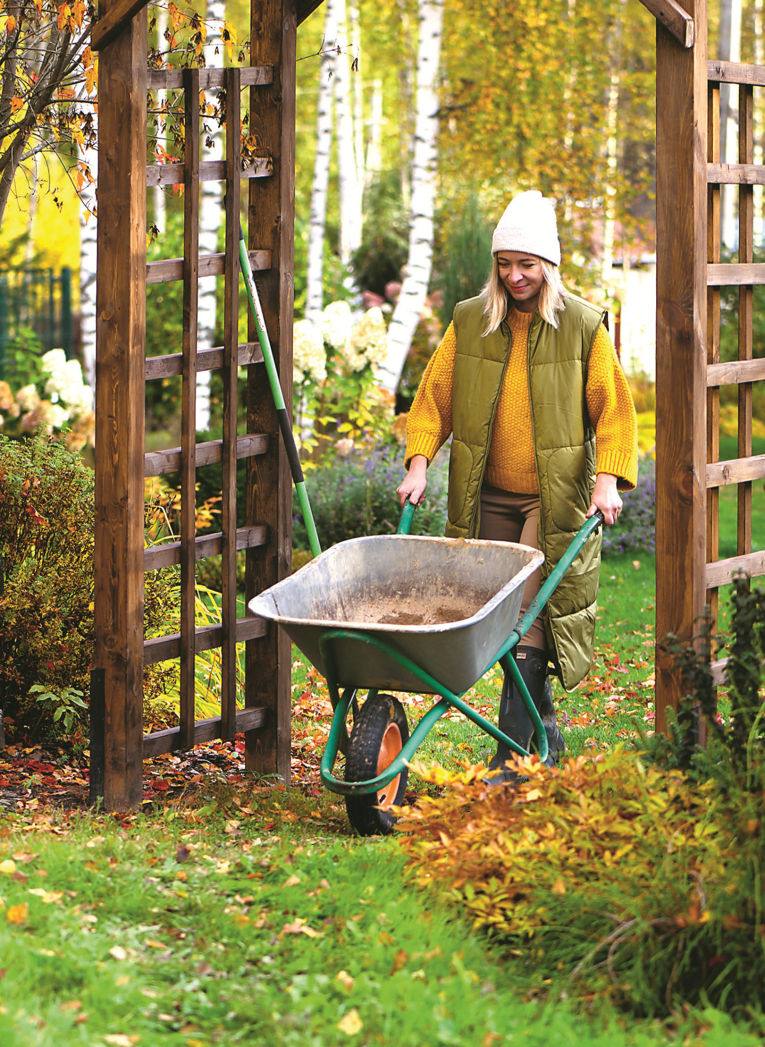 Позаботься о садовых инструментах – очисти их от земли, вымой, смажь лезвия лопат, мотыг и совков, заточи секаторы и садовые пилы и спрячь инвентарь в сухое место – до будущего сезона. Просуши и убери укрывной материал и пленку, а тепличные рамочные ограждения перед отправкой на хранение продезинфицируй 3–5% раствором медного купороса и просуши. Перенеси в подсобные помещения легкую садовую мебель, глиняные горшки и скульптуры, а также другие мобильные элементы, которые могут пострадать от сырости, холода и резких колебаний температуры.