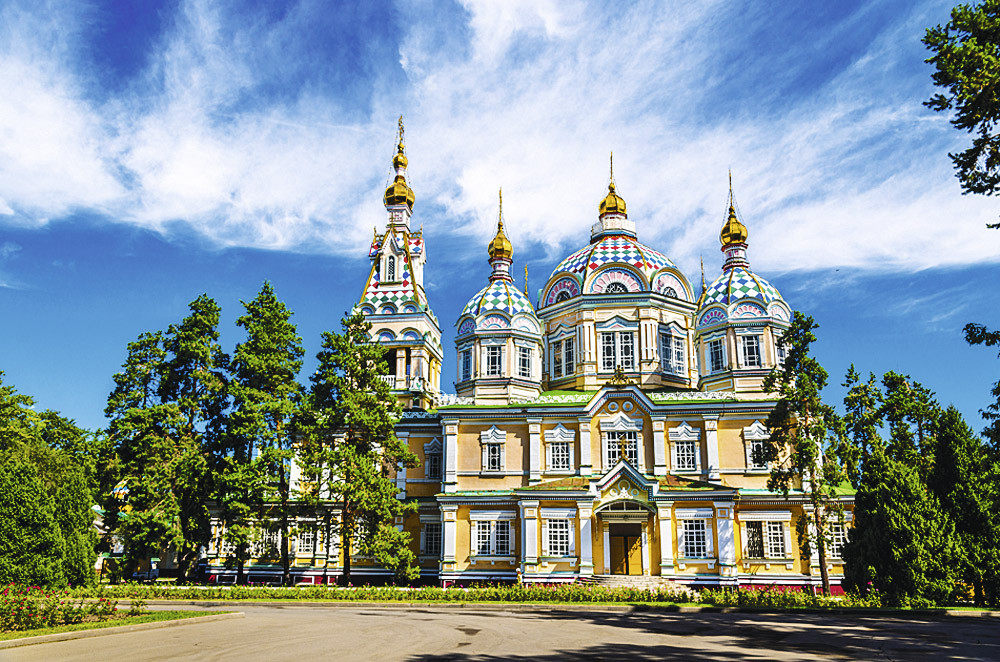Садимся на фуникулер – и вперед на Кок-Тобе, туда, где стоит городская телебашня. В саму башню не пускают, зато у ее подножия раскинулся отличный парк развлечений с аттракционами. И если дымка рассеется, можно увидеть весь город внизу. А из кабинки колеса обозрения, заменяющего смотровую площадку на телебашне, виды и вовсе умопомрачительные. Где-то там среди крыш тянутся к небу минареты, купола и шпили духовных обителей. Среди них первую скрипку играют мусульманская Центральная мечеть и православный Вознесенский кафедральный собор. Алма-Атинская мечеть, одна из крупнейших во всем Казахстане, была построена относительно недавно, в 1990-е годы. Однако в ее основании – земля, где раньше стояла историческая Татарская мечеть, которая то разрушалась, то восстанавливалась и окончательно сгорела в 1986 году. А вот Вознесенский собор дошел до наших дней в почти первозданном виде. Открывшийся в 1907 году, он геройски выстоял во время землетрясения 1910 года.