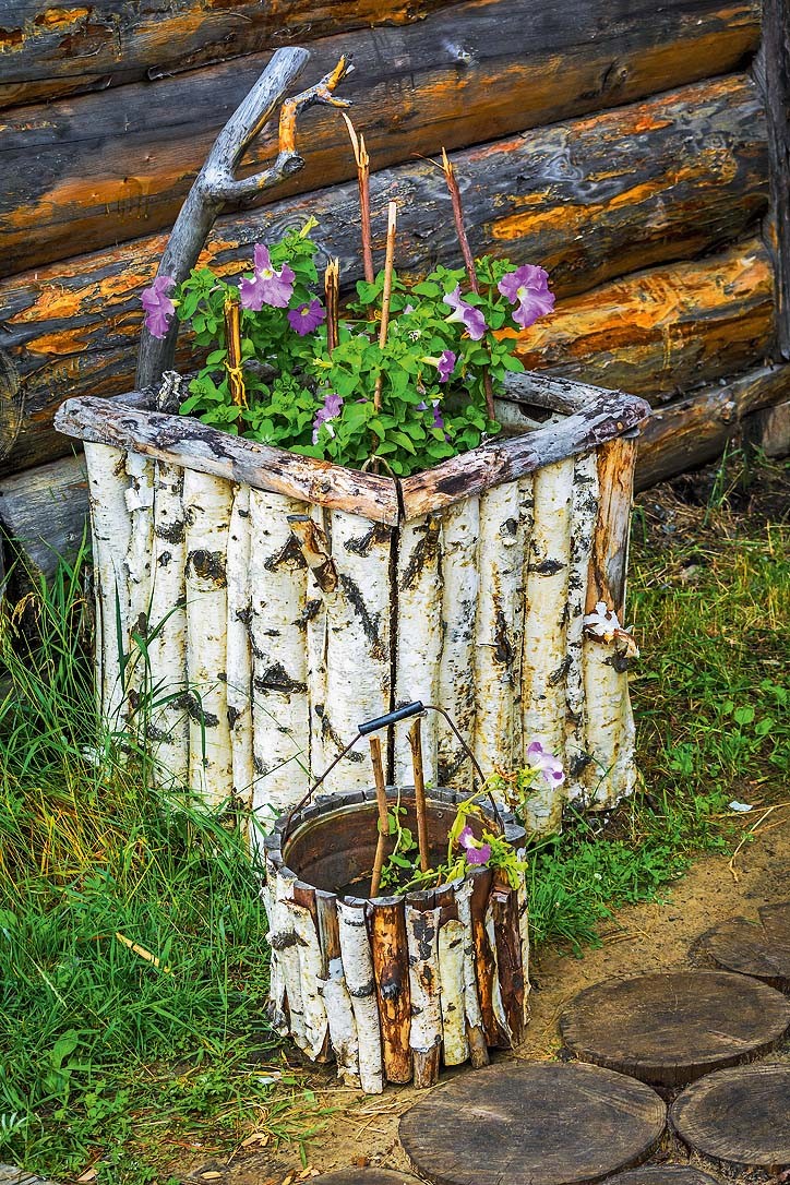 Ветки березы и другого дерева, сбитые вместе, могут стать основой для создания вот такого лаконичного и одновременно красивого ящика. В него можно посадить как любые цветы, так и что-нибудь к столу – зелень, томаты, ягоды и т.д. Главное, найти подходящее место – такая красота, созданная своими руками, должна быть на виду!