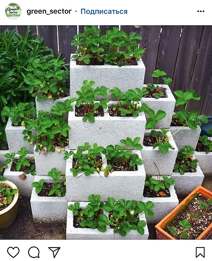 После ремонта на участке остались лишние шлакоблоки? Используй их не по назначению. Расставь, как на фото, и посади в отверстиях ягоды или любую зелень.