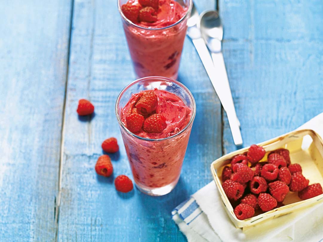 ИНГРЕДИЕНТЫ: • 100 г малины • мед по вкусу • 200 мл натурального йогурта