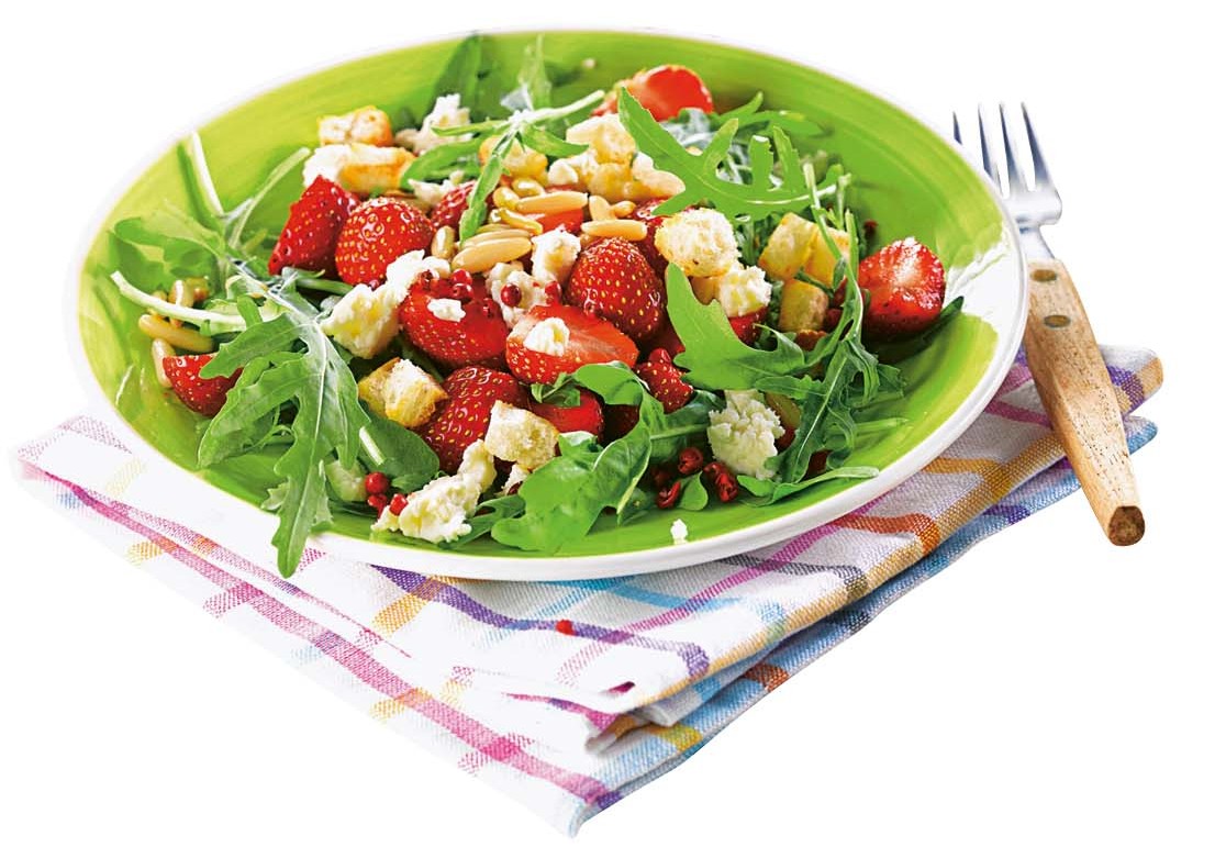 ИНГРЕДИЕНТЫ: • 70 г рукколы • 200 г клубники • 100 г мягкого сыра • растительное масло • перец
