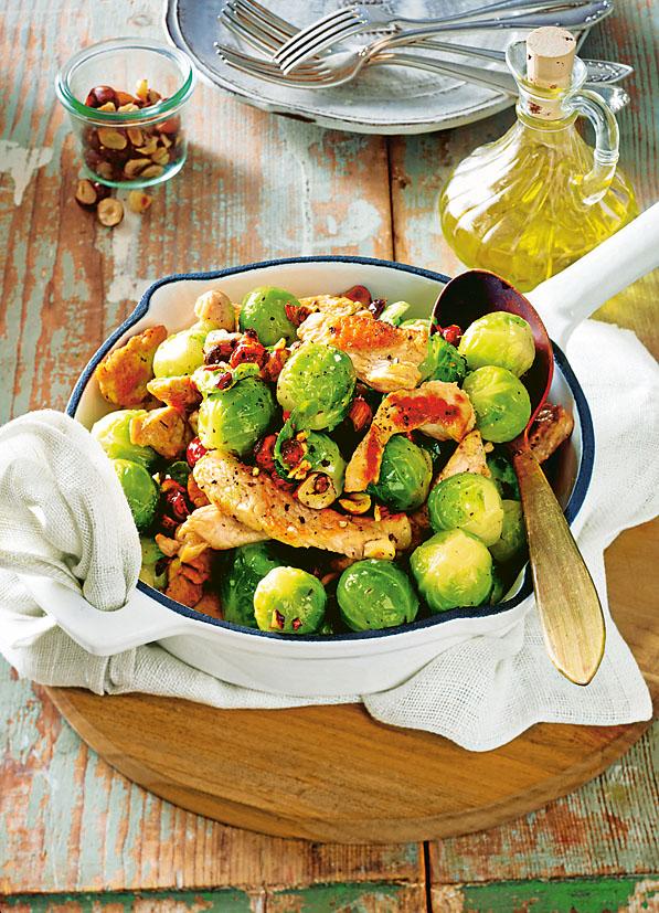 лук мелко режь, морковь натри на средней терке. Филе индейки нарежь на небольшие кусочки. Обжарь лук и морковь, добавь филе, посоли, поперчи. Брюссельскую капусту положи в кипящую подсоленную воду, вари 10 минут с момента закипания. Затем капусту добавь к филе, перемешай, обжаривай 5 минут.