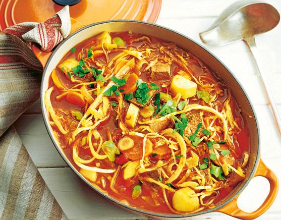 отвари говядину. Готовое мясо остуди и раздели на кусочки. Капусту нарежь соломкой, картошку – кубиками, лук и морковь натри на крупной терке. В бульон без мяса выложи капусту с картофелем, доведи до кипения и сними пену. Обжарь до золотистого цвета морковь и лук, добавь нарезанные помидоры (свежие или консервированные). Затем выложи в кастрюлю с овощами. Добавь специи, 1 ч.л. тмина и вари на медленном огне 20 минут. Подавай с зеленью.