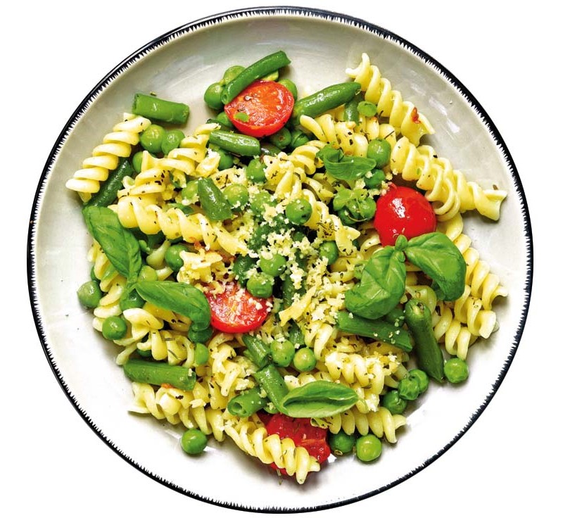 ПРИГОТОВЛЕНИЕ: фасоль порежь на кусочки длиной 4–5 см. Брокколи разбери на соцветия. Цукини порежь и обжарь в сковороде, добавь измельченный чеснок. С лимона сними цедру, выжми сок. Свари пасту аль-денте. За 5 минут до готовности добавь в воду фасоль, брокколи и горошек. Слей воду, оставив 50 мл в отдельной емкости. В кастрюлю верни пасту с овощами, добавь цукини, половину цедры лимона и 1–2 ч.л. сока лимона, 1 ст. л. растительного масла, сливочный сыр и базилик. Подсоли и поперчи. Все перемешай, добавь немного воды, в которой варилась паста, и подержи 2–3 мин под крышкой. Готовую пасту посыпь оставшейся цедрой и пармезаном.