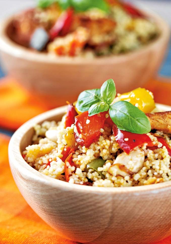 ИНГРЕДИЕНТЫ: • 200 г кускуса • сладкий перец • репчатый лук • морковь • небольшой кабачок • 2 зуб. чеснока • 400 мл бульона