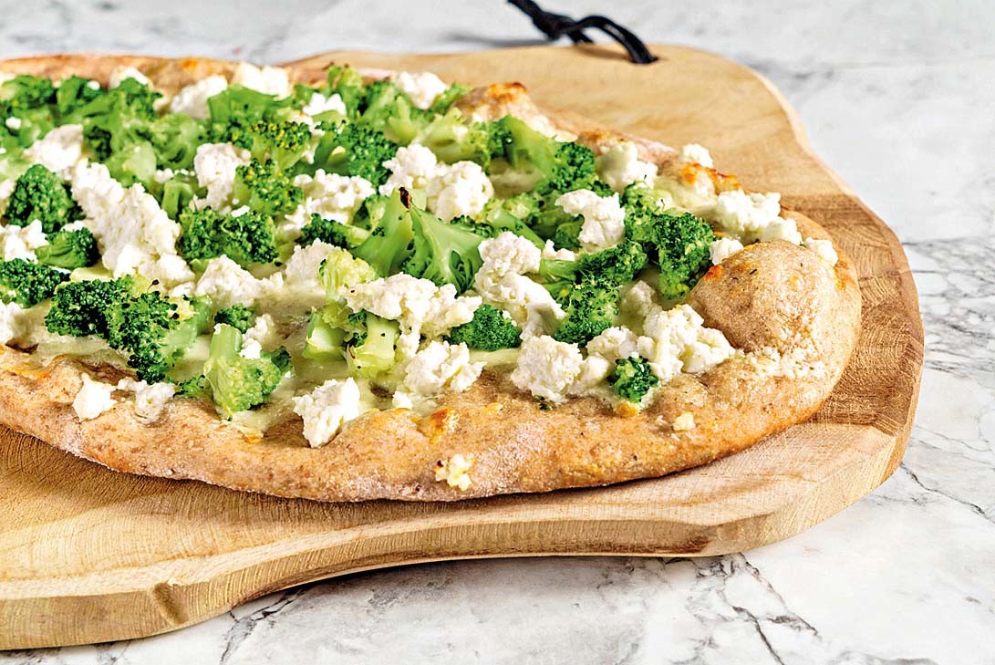 ПРИГОТОВЛЕНИЕ: брокколи раздели на небольшие соцветия и отвари в кипящей подсоленной воде 3–4 мин. Откинь на дуршлаг. Тесто для пиццы раскатай и выложи на противень. Смажь тесто соусом песто и посыпь пармезаном. Затем добавь брокколи, очищенный и нарезанный кольцами или полукольцами лук. Сверху распредели нарезанный кубиками сыр фета и посыпь пиццу кедровыми орешками. Поперчи. Запекай в предварительно разогретой до 2200 духовке в течение 12–15 мин. Перед подачей можно посыпать пиццу рукколой.