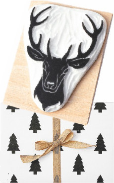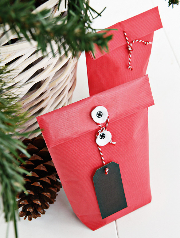Популярная новогодняя и рождественская тема – северный олень – может найти свое воплощение и в декоре подарочной упаковки. Все очень просто – вырезаешь из цветной бумаги рожки, носик, глазки и наклеиваешь на обычную крафтовую бумагу. Так легким движением руки скучная обертка превращается в веселый сюрприз.