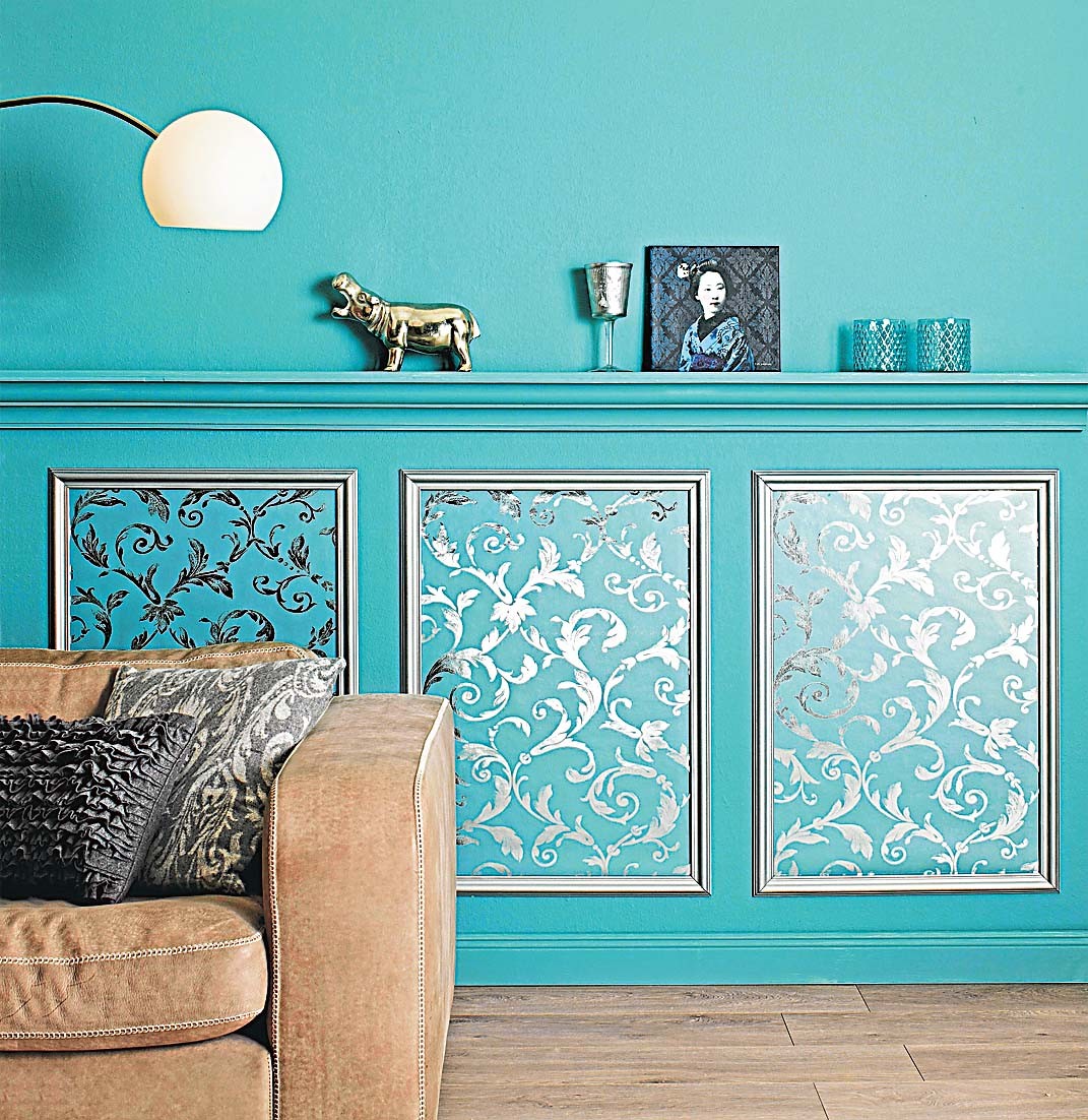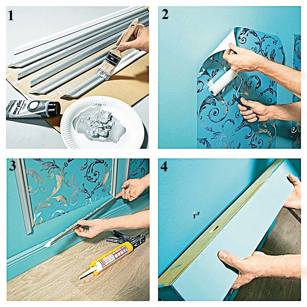 2. Наклей обои. Из самоклеящихся или бумажных обоев вырежи прямоугольники 60 х 80 см, нанеси метки на стену и наклей без «пузырей» с помощью валика.