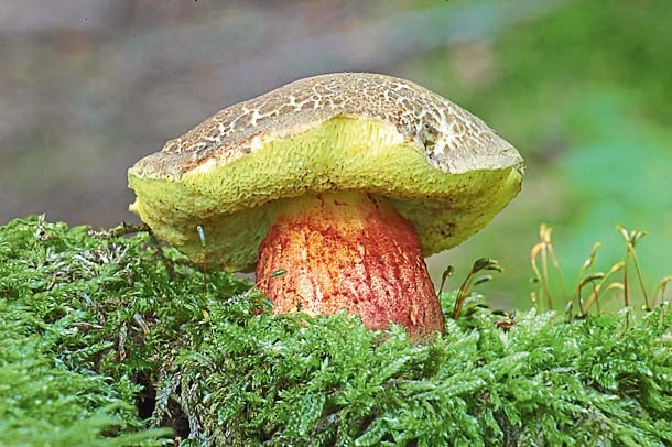 Сатанинский. У него бархатистая светлая шляпка сероватого или оливкового цвета и красноватая ножка (на срезе синеет или краснеет).