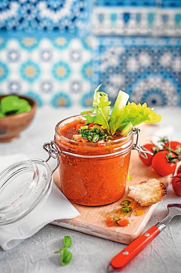 Приготовление: все овощи нарежь и измельчи в блендере, добавь соль, 3 ст. л. оливкового масла и винный уксус по вкусу. Перемешай и убери в холодильник на 1–2 часа. Подавай холодным, украсив зеленью.