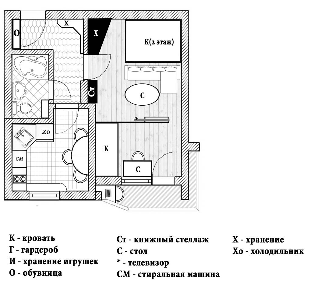 1. Подели кухню на несколько зон, где можно готовить, работать, принимать гостей, хранить вещи. В комнате построй стену и спрячь за ней кровать, а остальную часть используй как детскую. Также можно увеличить кухню или комнату за счет коридора!