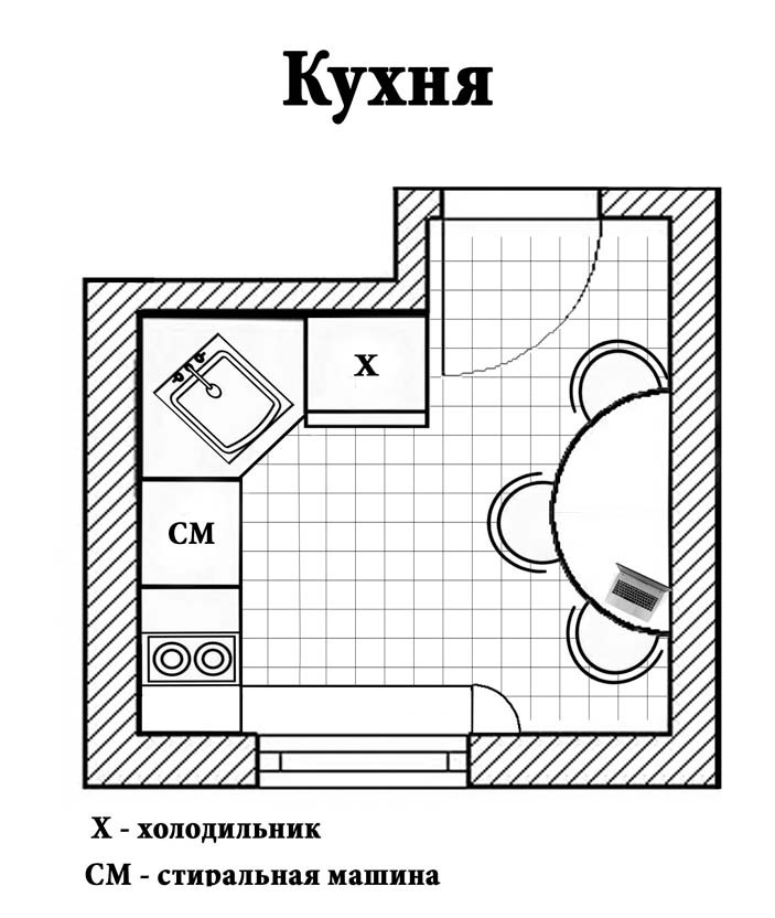 Оптимизируй пространство за счет расстановки мебели. В нашем примере (см. слева) стиральная машина – под столешницей, рядом – небольшая плита, в обеденной зоне – полукруглый стол, под подоконником – узкий шкаф. Уже просторно!