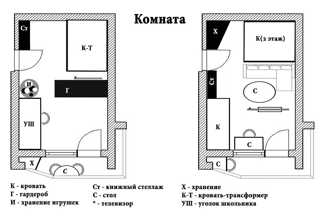 Рис. 1: кровать-трансформер, гардероб – перегородка с телевизором, уголок школьник (на 2-м ярусе кровать, снизу игровая зона). Рис. 2: кровать родителей на втором ярусе, под ней – зона для хранения. В гостевой – телевизор и складной столик.