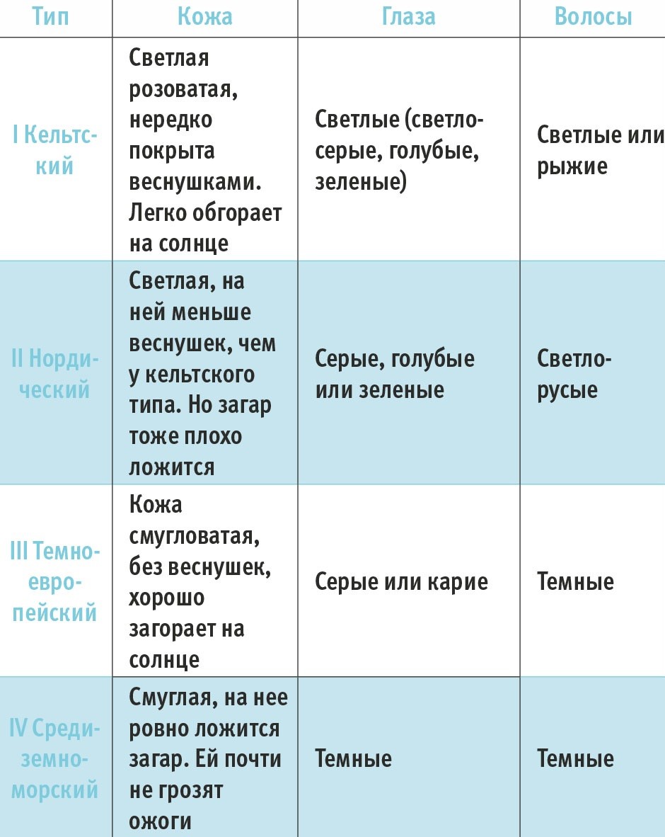 1. УЗНАЙ СВОЙ ТИП КОЖИ. Для каждого типа существует определенное время, которое можно проводить на солнце, не опасаясь сгореть. Для первого типа – это 3–4 минуты, для второго – 5 минут, для третьего – 7, для четвертого – 15.