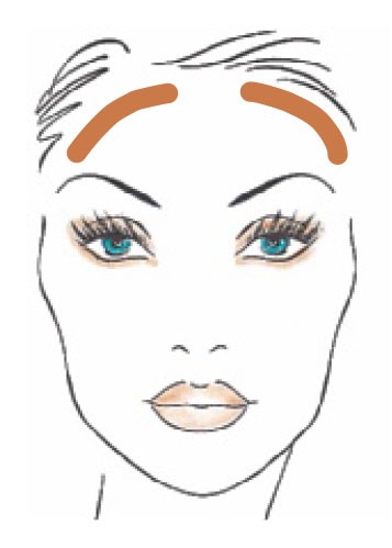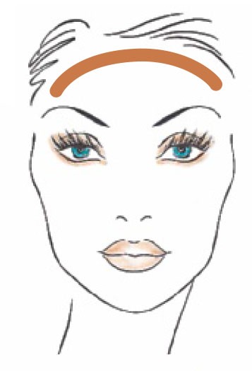Нанеси бронзовую пудру с обеих сторон лба, двигаясь от линии роста волос к внешнему краю брови. Кистью растушуй линии. Вместо пудры можно использовать персиковые румяна.