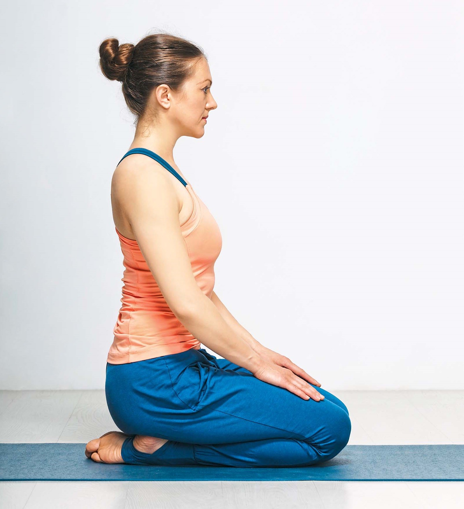 Встань на колени, опусти таз на икры, ладони помести на колени. Выпрями спину, лопатки опусти вниз. Не допускай излишних прогибов в спине, иначе не будет должного эффекта. Но при этом не напрягай спину. Задержись в этой асане на 5–7 дыхательных циклов.