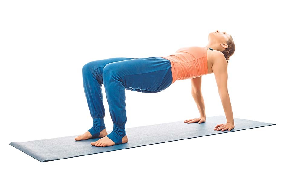 Сядь на пол, согни ноги в коленях. Помести руки за спину. Пальцы должны быть широко расставлены и обращены к ногам. Отведи плечи назад, соедини лопатки. Подними бедра вверх так, чтобы тело образовывало прямую линию. Задержись в этой позе, сделай 5–7 вдохов-выдохов.