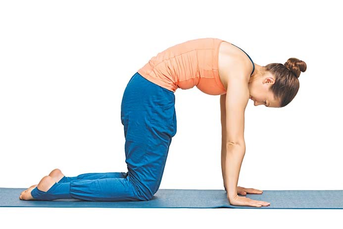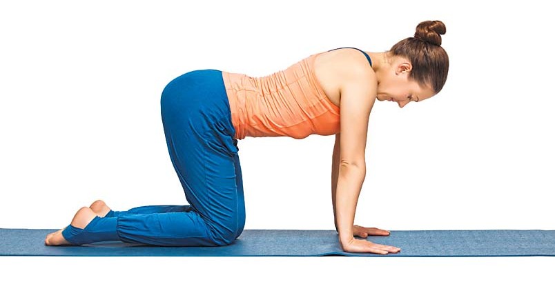 Встань на четвереньки так, чтобы ноги и руки находились под прямым углом к телу. На вдохе прогнись в пояснице и тяни голову вверх, не отрывая ладоней от пола. На выдохе, наоборот, выгни спину, втяни живот, а голову опусти вниз. Сделай 5–7 таких вдохов-выдохов.