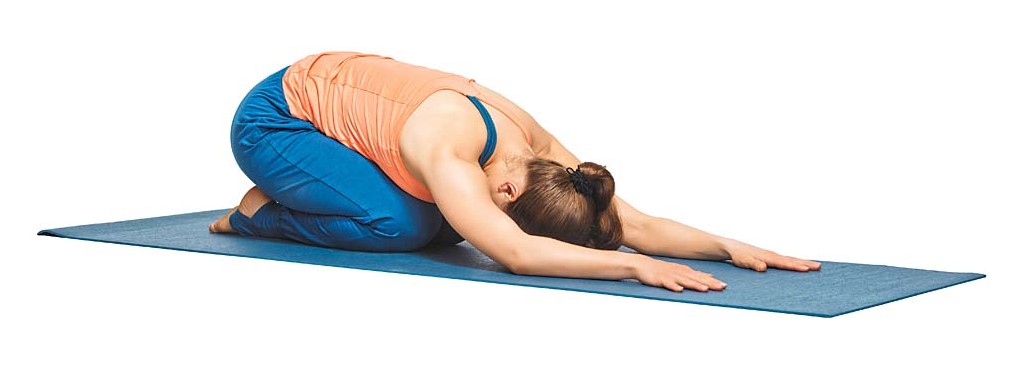 Медленно наклонись вперед, ягодицы опусти на пятки. Головой коснись пола и вытяни руки вперед. Задержись в этом положении, старайся максимально расслабиться и сохранять спокойное дыхание. Сделай 5–7 вдохов-выдохов.