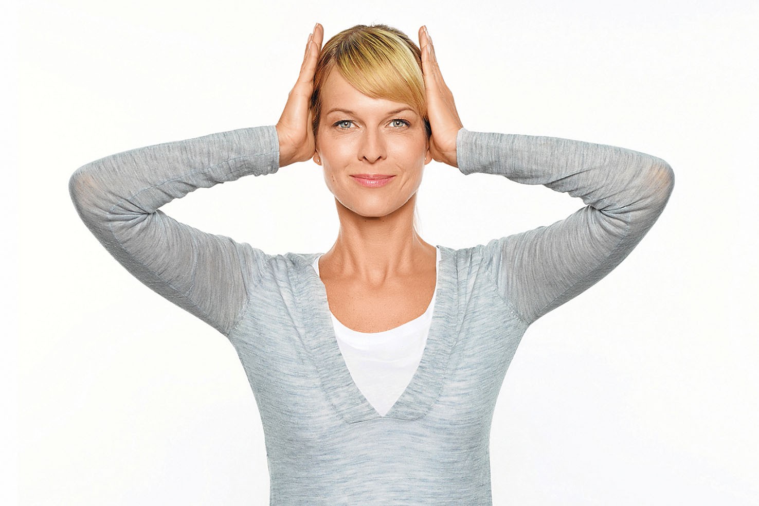 Положи ладони на область висков, как показано на фото. Выбери глазами какой-то объект (например, картину на стене) и зафиксируй на нем взгляд.