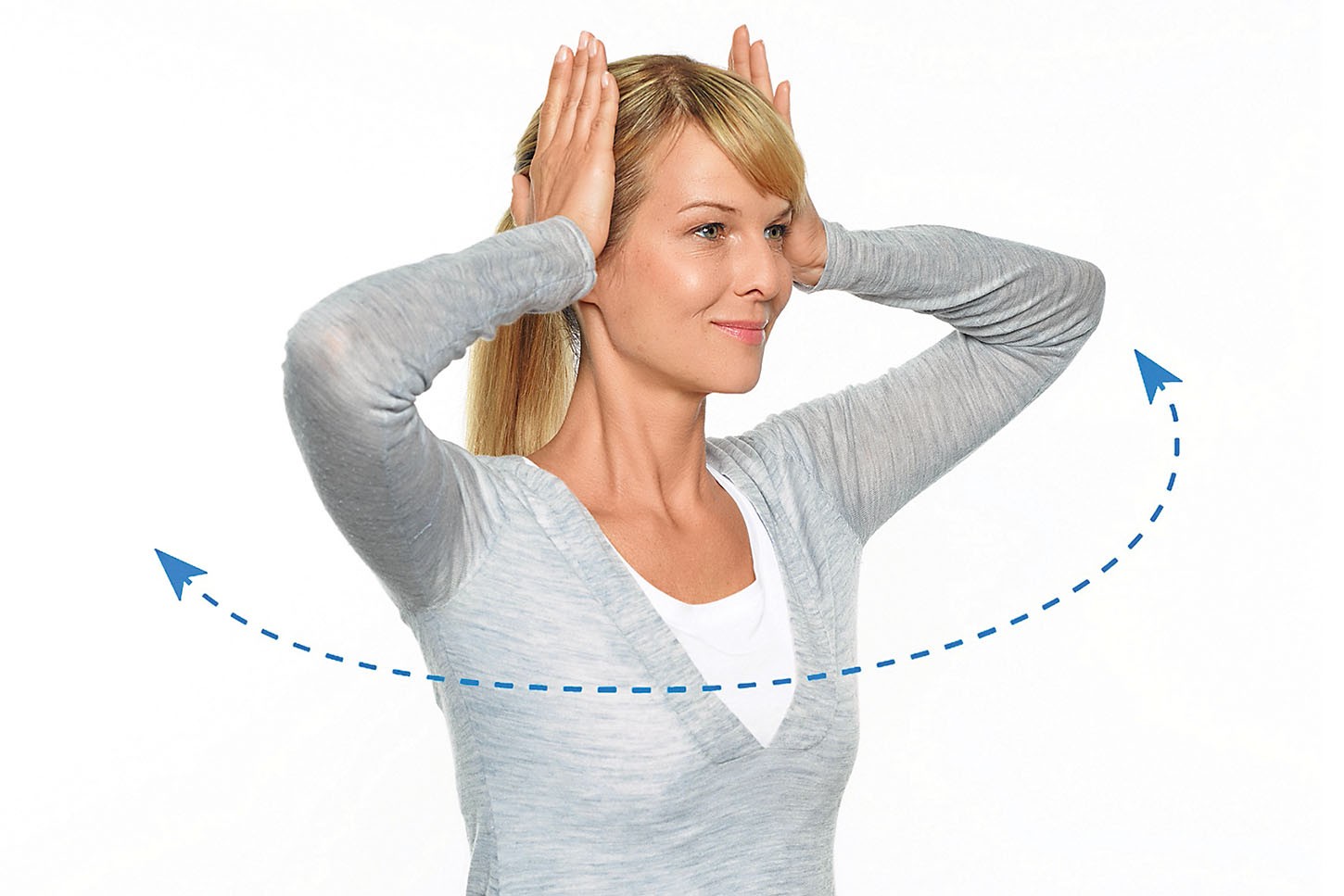 Сядь, выпрями спину. Вытяни руки перед собой и задержи взгляд на пальцах левой руки. Отставь руку назад, плавно опиши ею круг по часовой стрелке и против нее.