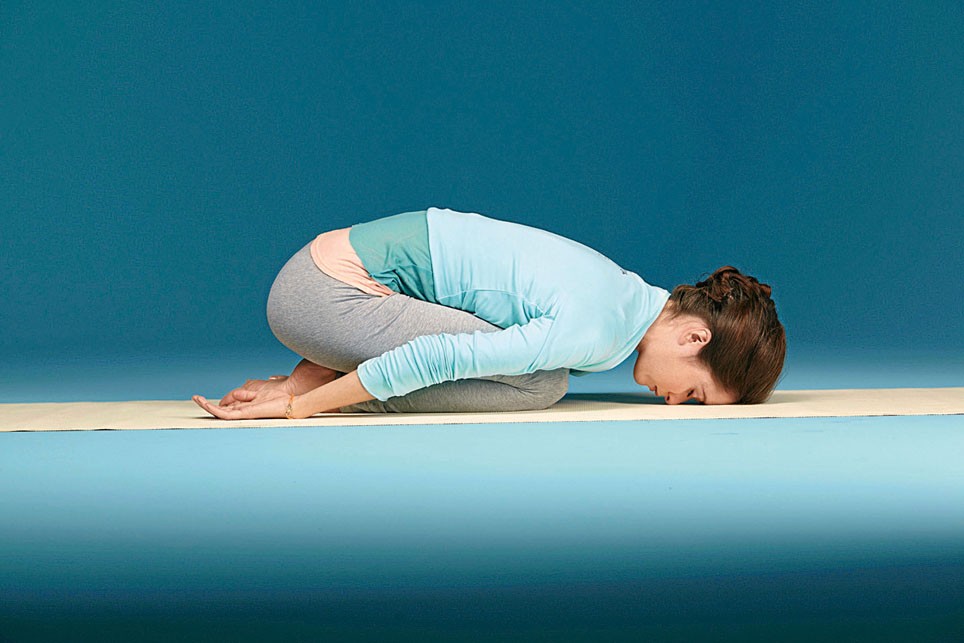 Встань на колени на полу. Опустись ягодицами на пятки и наклонись вперед. Коснись лбом пола. Дыши глубоко и постарайся максимально расслабиться. Оставайся в этом положении в течение одной минуты.