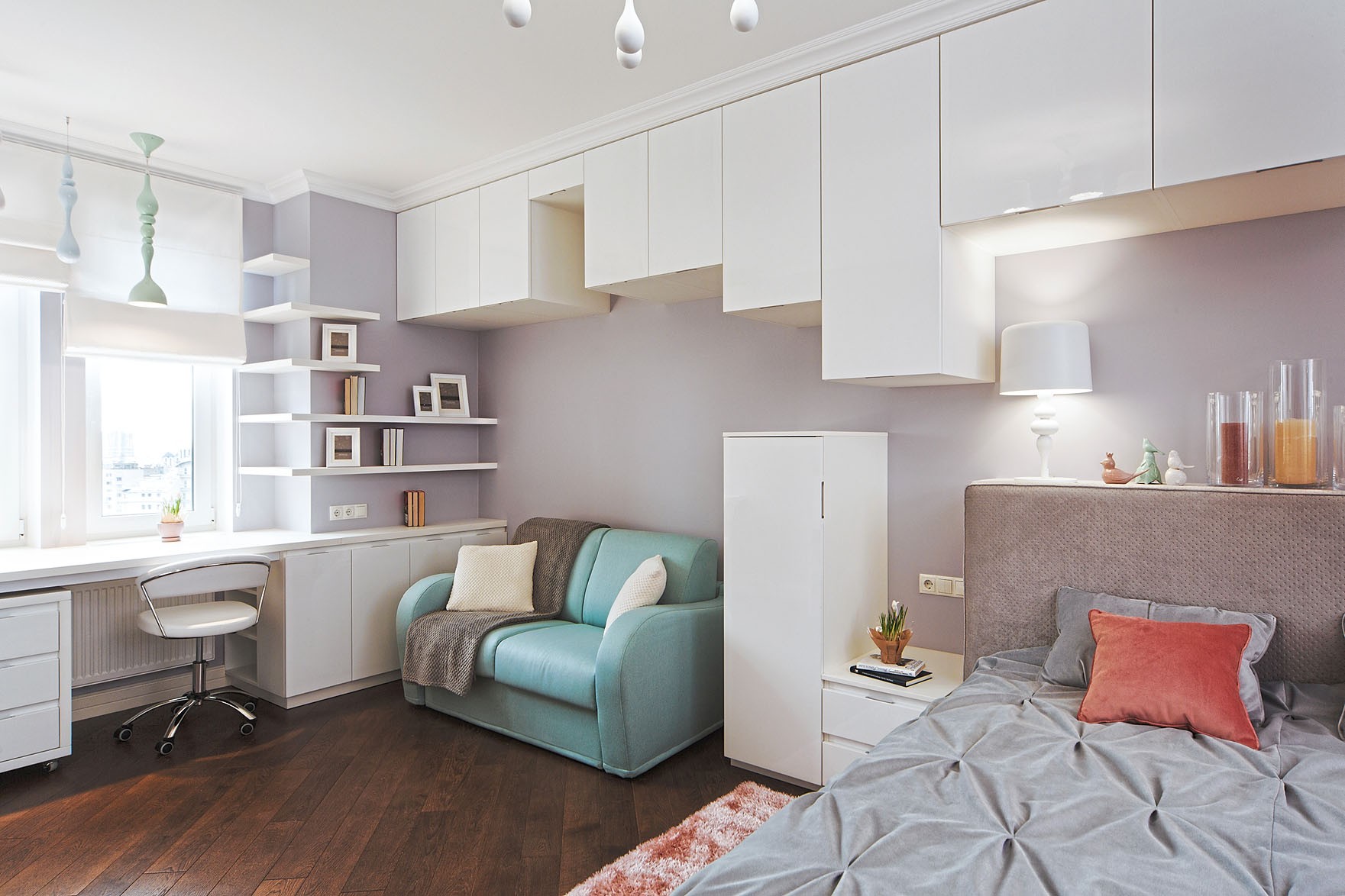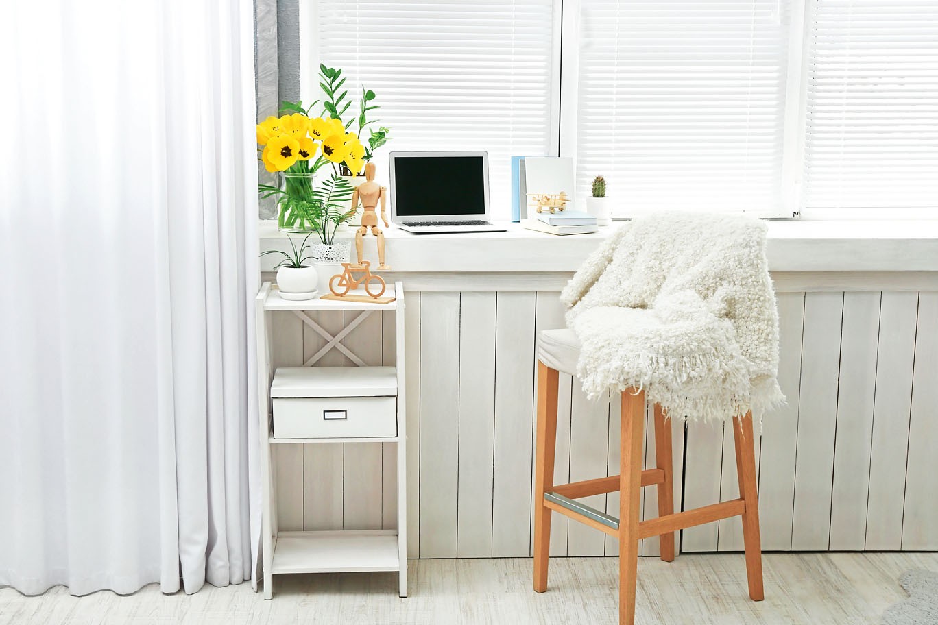 Подоконник может стать удобной и светлой рабочей зоной, если использовать его как письменный стол и разместить на откосах окна легкие полочки.