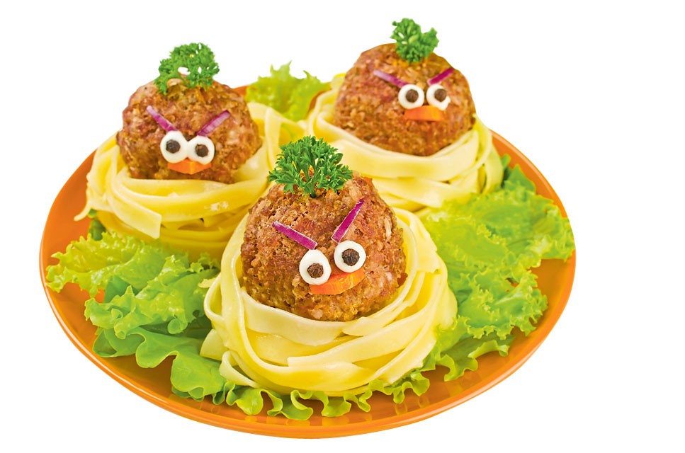 ПРИГОТОВЛЕНИЕ: сформируй из макаронов «гнездышки» и помести туда «птенцов». Помести их на лист салата. Из яичного белка смастери глаза, зрачки – из оливок. Из лука – брови, из моркови – клювики. Аккуратно вдавливай ингредиенты в котлетки, чтобы они держались.