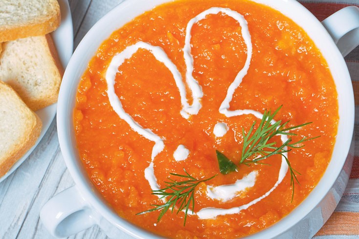 ПРИГОТОВЛЕНИЕ: налей в тарелку суп-пюре, а жирные сливки – в чайную или десертную ложку. Капни сливки на поверхность супа. Зубочисткой, деревянной палочкой или кончиком ножа соедини капли в желаемый рисунок. Приделай зайчику «усики» из укропа.
