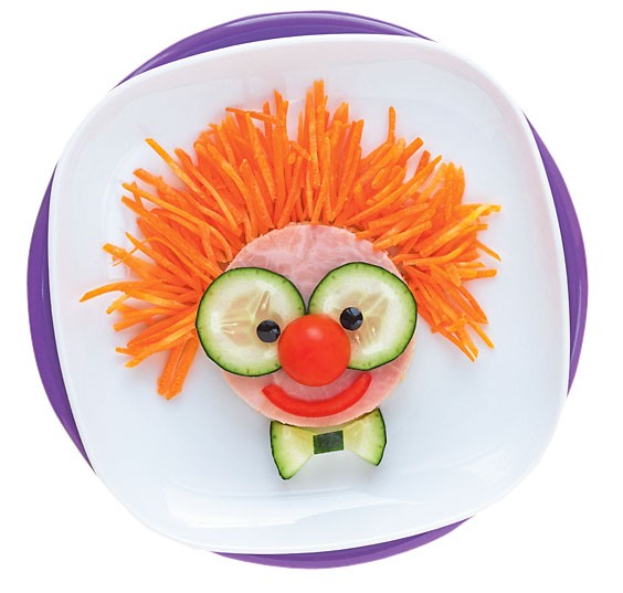 ПРИГОТОВЛЕНИЕ: выложи нарезанную морковь вокруг ветчины, сделай из огурца глаза и галстук-бабочку. Нос клоуна – помидор черри, рот – сладкий перец.