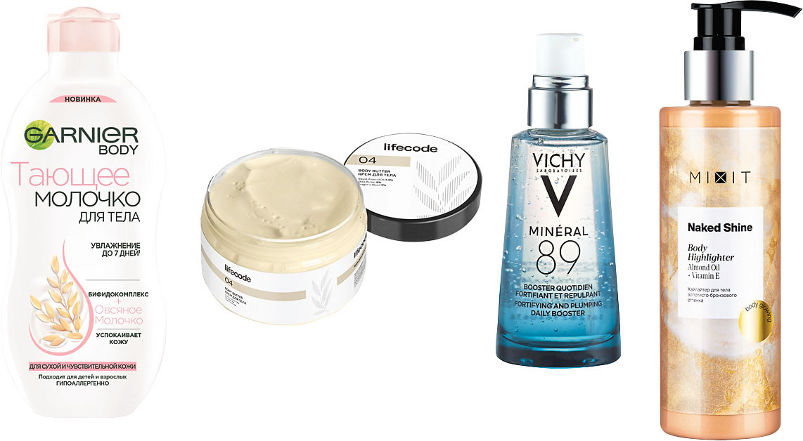 Ощутимую пользу в процессе поддержания водного баланса принесет миндаль – источник жизненно важного для кожи витамина Е. По этой же причине не забывай про главную звезду ЗОЖ-фотосессий – авокадо. На тостах, в смузи или салате – этот плод везде выглядит фотогенично и помогает тебе Золотисто-бронзовый хайлайтер для тела от MIXIT Ежедневный гель-сыворотка Mineral 89 от VICHY не сталкиваться с дефицитом токоферола (того самого витамина Е). И, наконец, голливудские диетологи неспроста рекомендуют своим подопечным начинать день с зеленых смузи. Капуста кале, шпинат, петрушка не только способствуют детоксу, который необходим жителям мегаполиса для сияния кожи, но и содержат компоненты, вырабатывающие коллаген. Есть хорошие новости и для мясоедов. Белок – основа для построения мышечных, коллагеновых и эластиновых волокон. Так что любовь к белковым продуктам (отварной куриной грудке, стейкам на гриле, перепелиным яйцам и т. д.) вполне оправдана с точки зрения восстановления кожи после тех или иных стрессовых событий. Впрочем, растительный белок тоже хорош. Здесь традиционно рекомендуются белковые, злаковые и орехи.