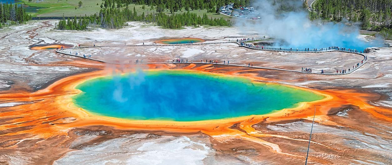 Кстати, он крупнейший в Йеллоустонском национальном парке. Его яркие цвета объясняются жизнедеятельностью бактерий и преломлением света. В парке проложены экотропы, так что гулять здесь довольно комфортно. Тем более, в отличие от многих других подобных источников, этот не имеет характерного неприятного запаха сероводорода.