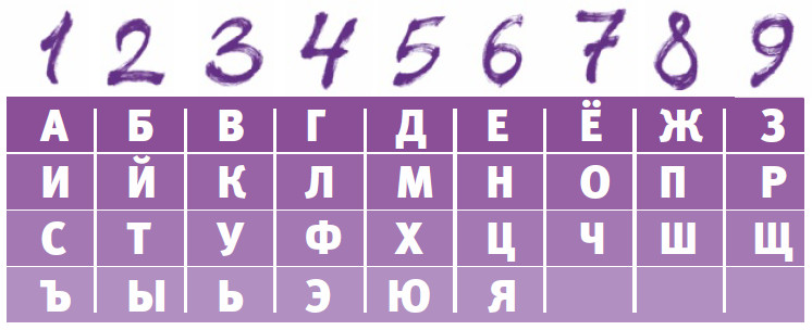 3. Выписать цифры, соответствующие твоему имени. Сложить их и привести результат к простому числу, от 1 до 9. Например, вычисляем нумерологический код имени Елена: