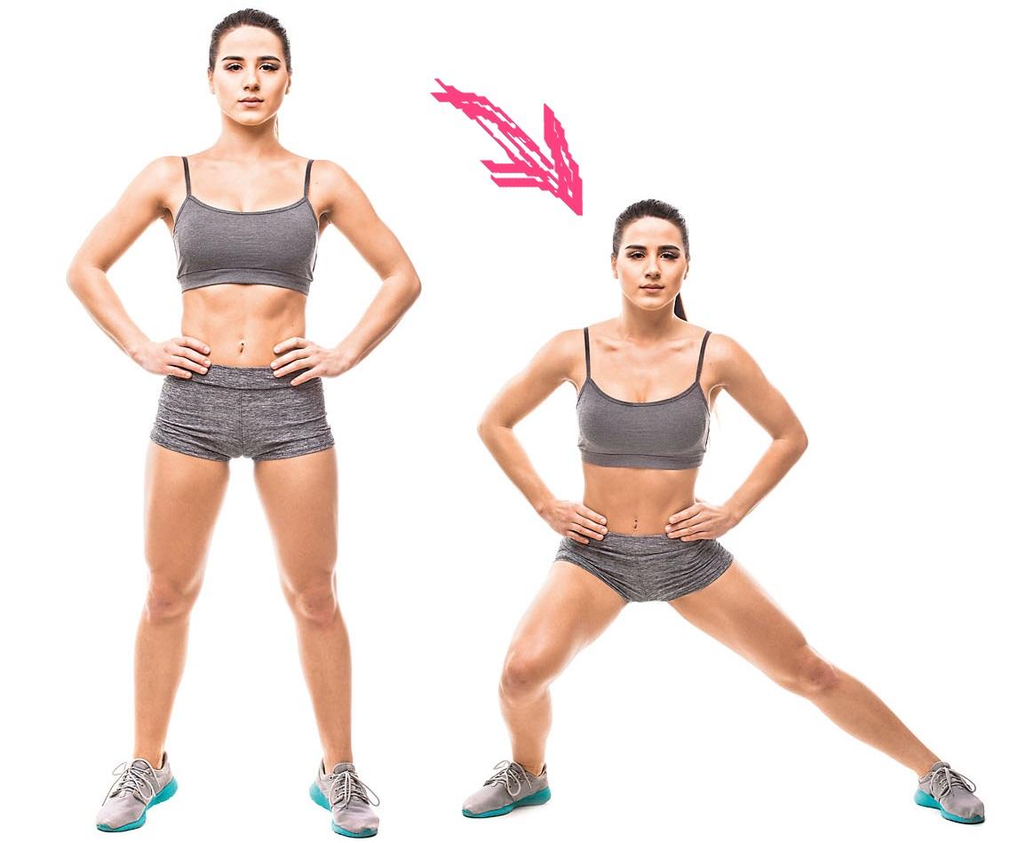 Стоя, ноги на ширине таза. Сделай шаг вправо или влево (стопы прижаты к полу). Удерживая колено над стопой, опусти таз так, чтобы бедра были параллельны полу. Повтори упражнение в другую сторону.