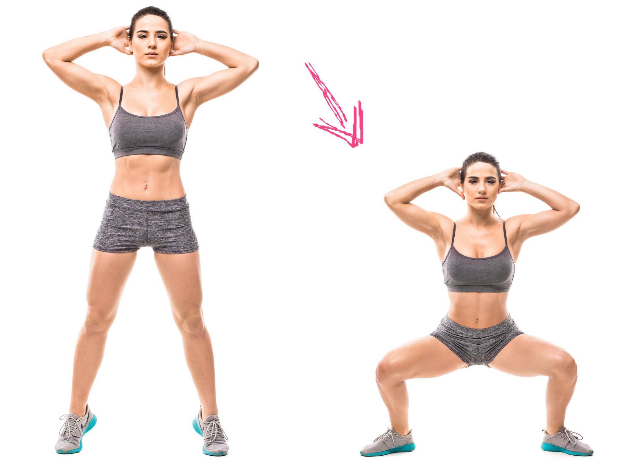 Стоя, ноги на ширине плеч, разверни стопы наружу на 30–45 градусов. Руки заведи за голову. Делая приседания, опускай таз так низко, чтобы колени были на уровне бедер.